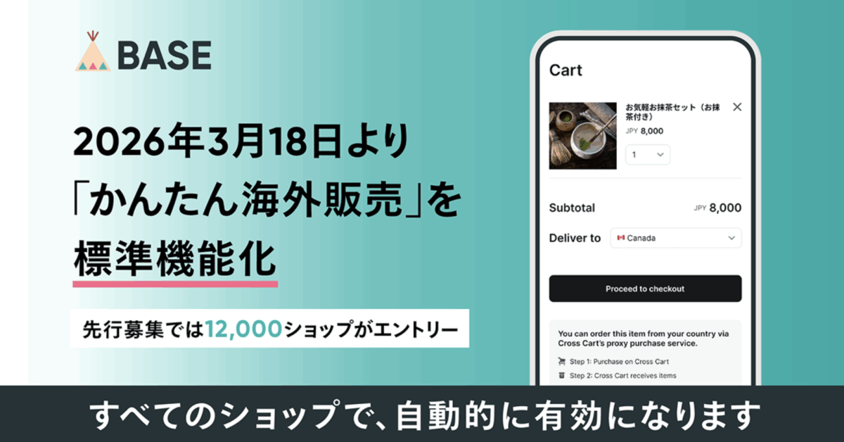 ネットショップ作成サービス「BASE(ベイス)」は、誰でもかんたんに商品を海外に販売できる機能「かんたん海外販売」を、「BASE」を利用するすべてのショップが、特別な設定や開発を必要とせず利用できる標準機能として、2026年3月18日(水)より提供開始。